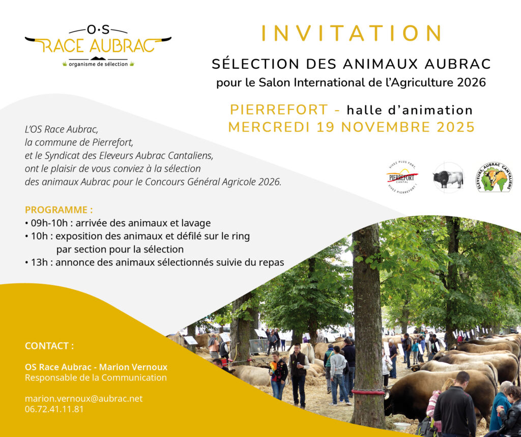 Il va bientôt être temps de procéder au recrutement des animaux Aubrac pour le Concours Général Agricole. La sélection aura lieu :